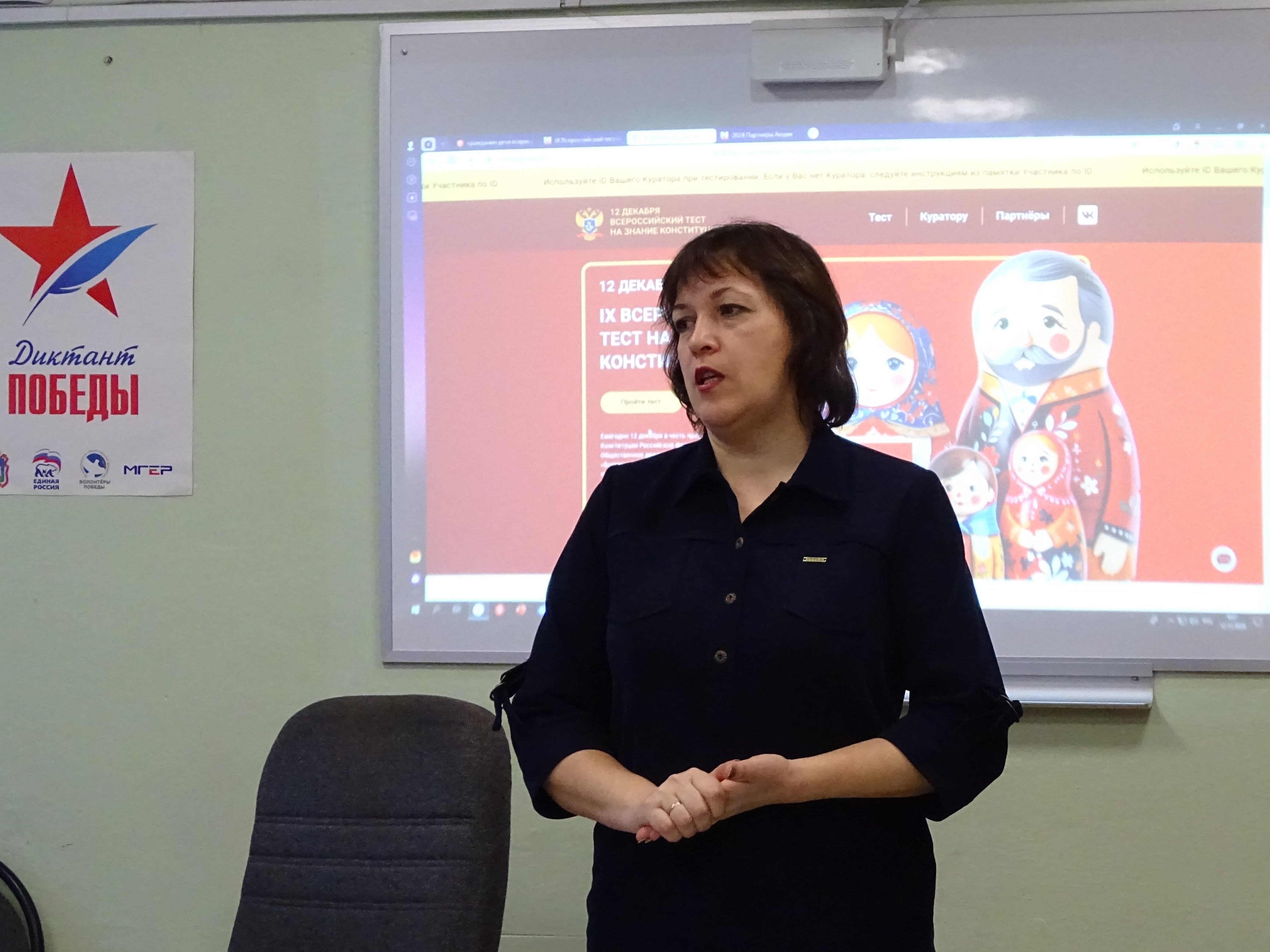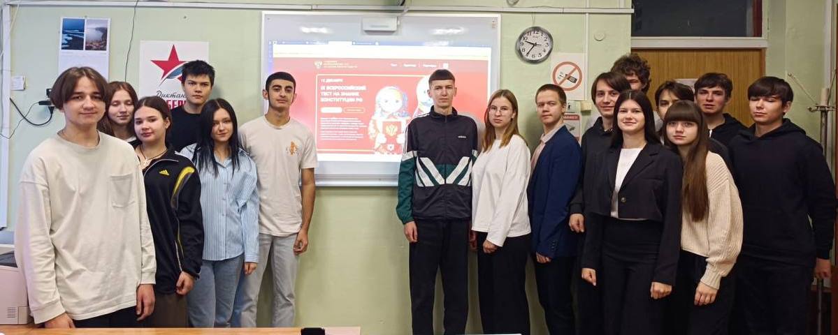 Заместителем директора Пентюховой Л.Н., учителем истории и обществознания Кисовой Н.В., классным руководителем Скворцовой Л.Н. была организована площадка для проведения акции «Всероссийский тест на знание Конституции РФ», в которой участвовали обучающиеся 10 класса. Тестирование проходило в онлайн-формате на сайте Гражданин. Дети. По окончании тестирования все участники узнали свои результаты и получили сертификаты о прохождении диктанта, что стало прекрасным знаком признания их усилий и стремления к знаниям.