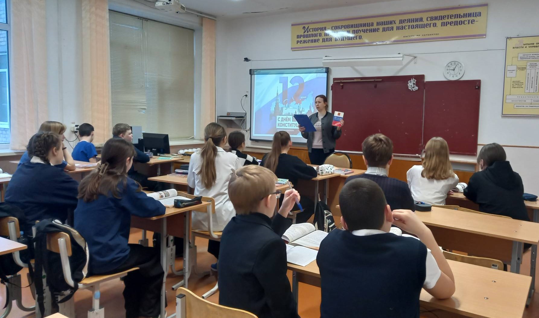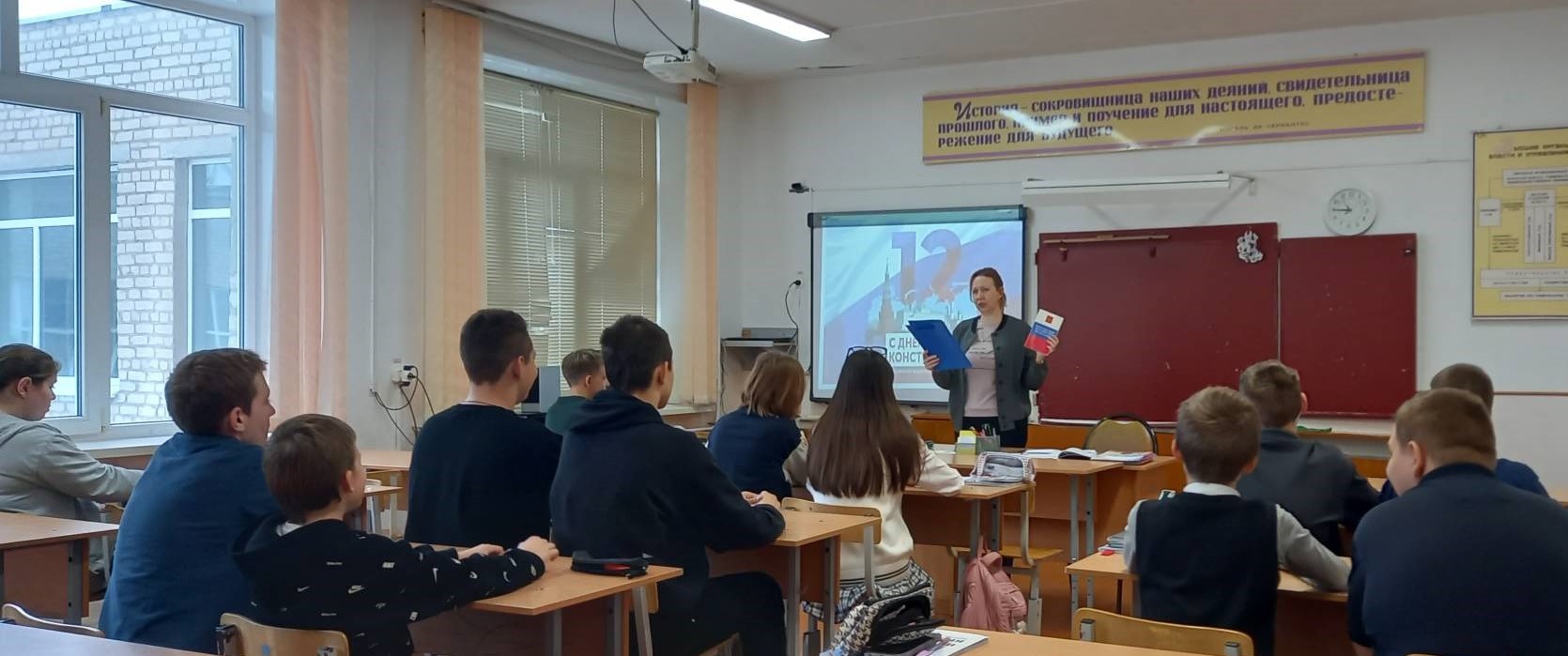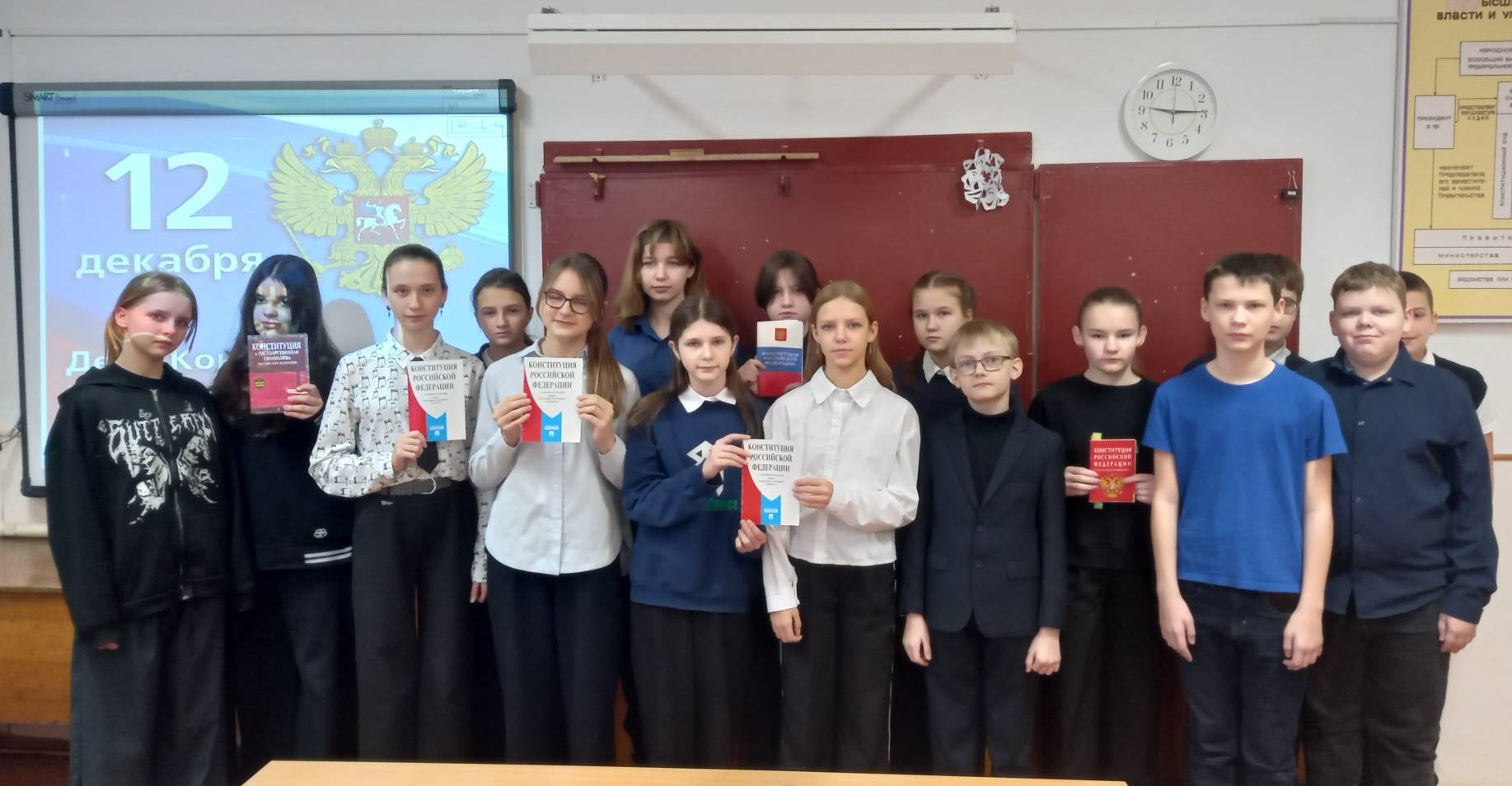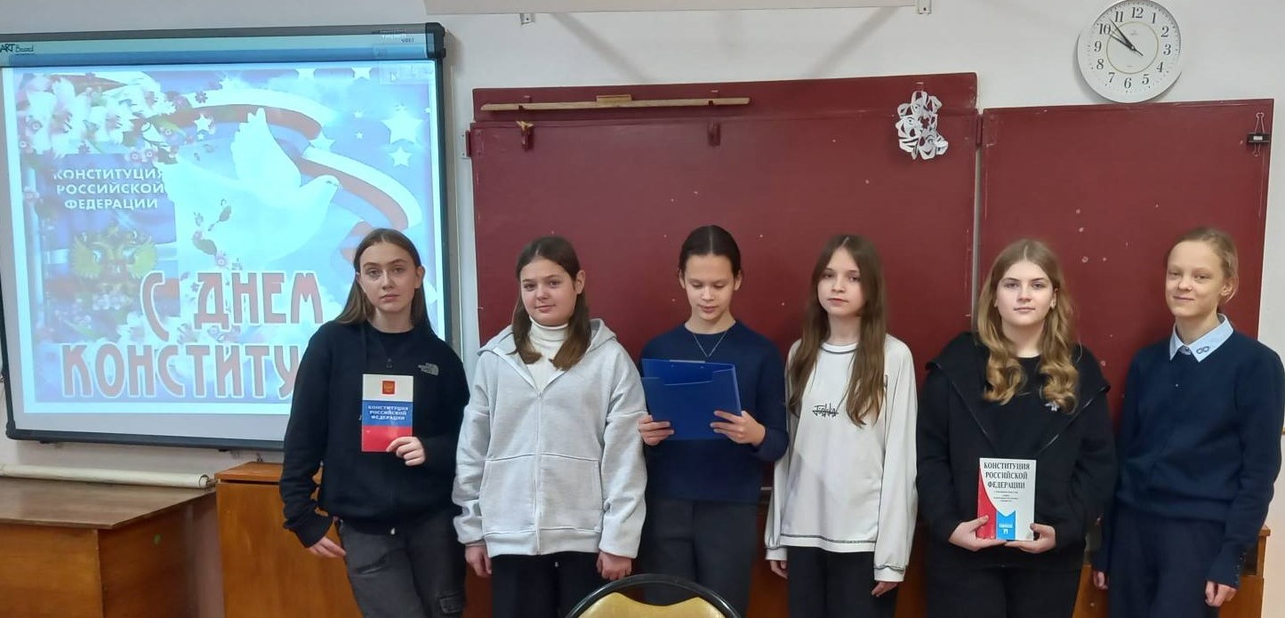 Учителя истории и обществознания Левина Т.В., Пименова Л.В. провели Уроки, посвященные истории формирования Конституции РФ: в форме часа правовой информации «Я гражданин своей страны» для 6-х классов, в форме круглого стола «История Конституции РФ – для 7-х классов».