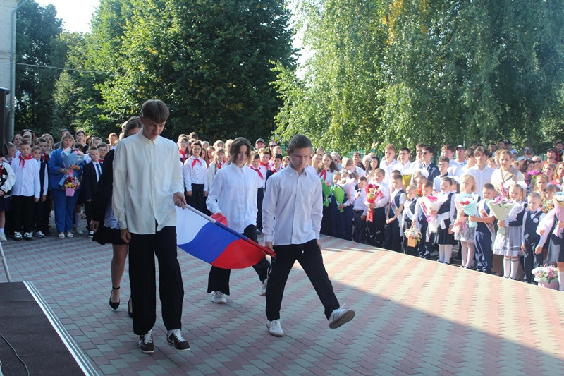 Торжественная линейка, посвящённая Дню знаний, началась с выноса и поднятия Государственного флага Российской Федерации активистами школы.