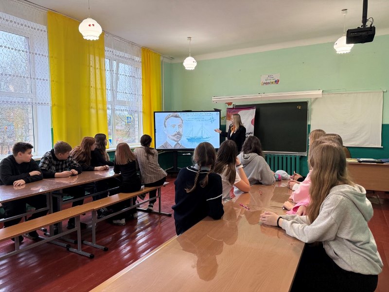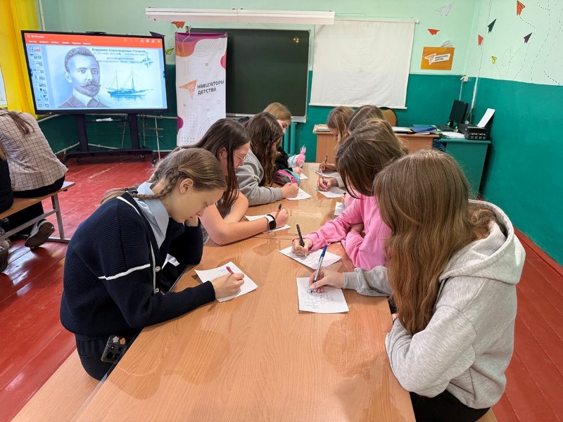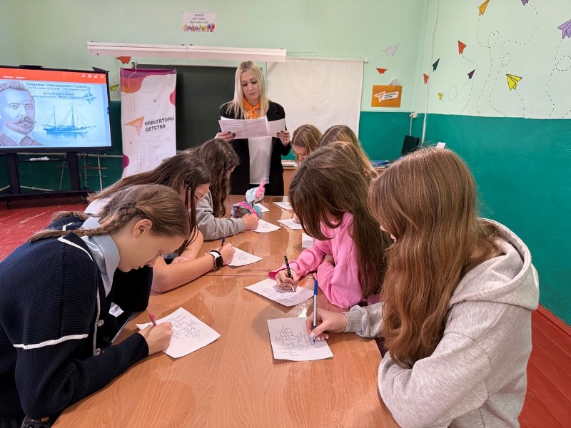 Накануне юбилея ученики 7-го «В» класса совместно с советником по воспитательной работе окунулись в атмосферу путешествий и открытий, изучив презентацию, посвященную жизни, научным трудам и экспедиционной деятельности В. А. Русанова. После просмотра состоялась дискуссия, а также прошла интересная игра-викторина в форме тематического кроссворда «Полярный исследователь В. Русанов».